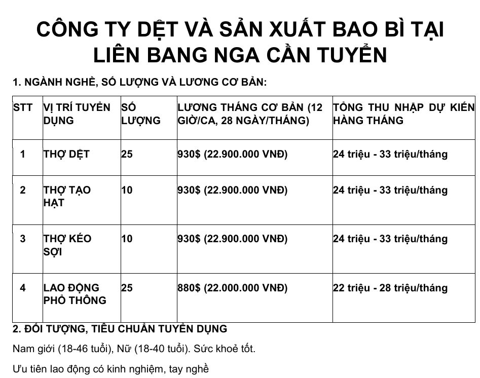 Công ty dệt và sản xuất bao bì tại Liên Bang Nga cần tuyển